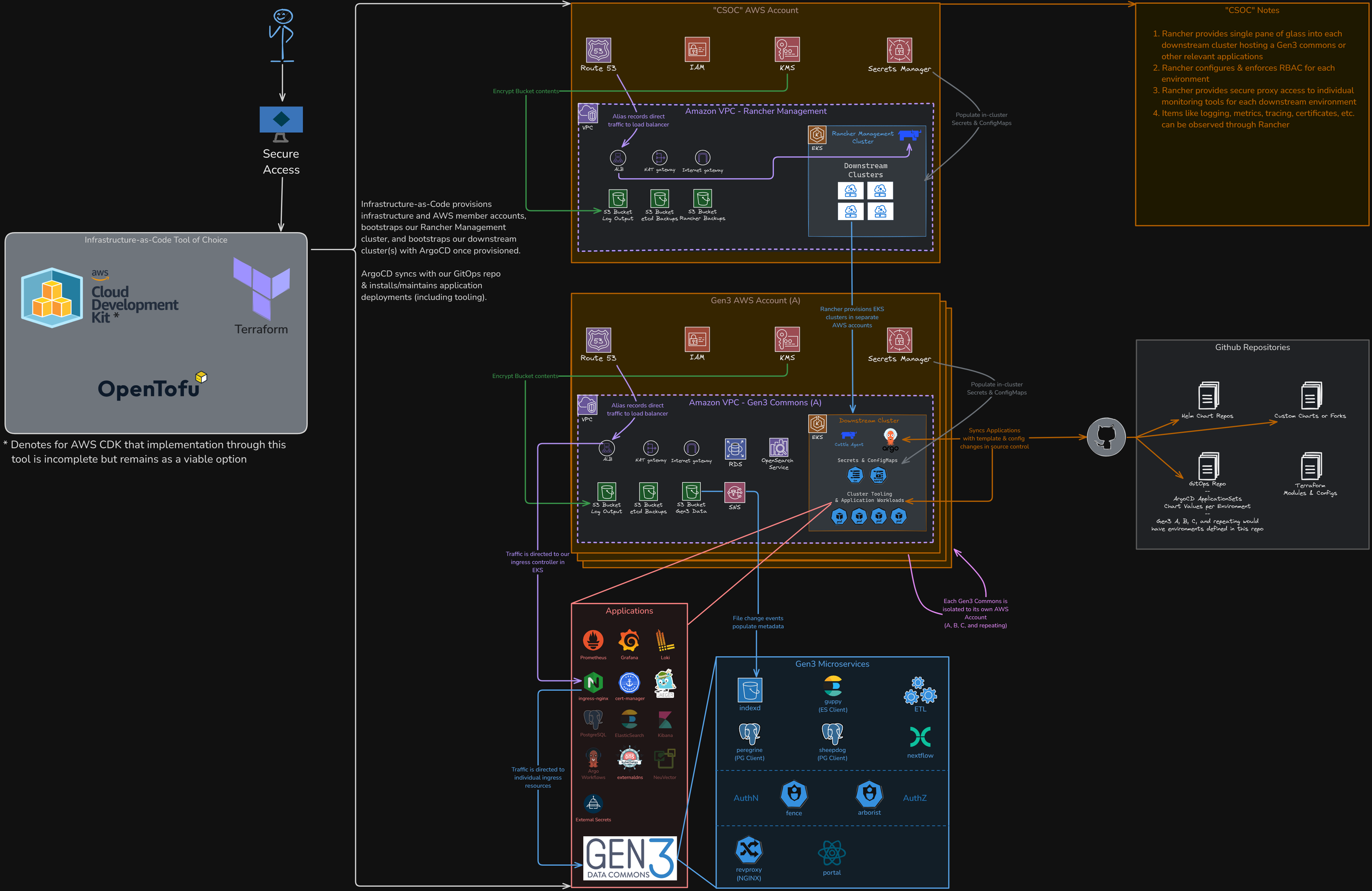 The CSOC architecture leverages industry-standard tools, such as Terraform, AWS CDK, and OpenTofu, to provision and manage complex AWS resources. With a focus on automation, security, and open-source integration, this design supports multi-tenant Gen3 environments across isolated EKS clusters, integrated with Rancher for cluster management and ArgoCD for GitOps-driven application deployment.